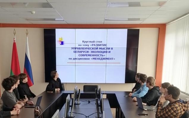 31 марта в рамках учебной дисциплины «Менеджмент» старший преподаватель кафедры цифровой экономики и менеджмента Ходенков Алексей Леонидович и студенты 1 курса направления «Экономика» провели круглый стол на тему «Развитие управленческой мысли в Беларуси: эволюция и современность», посвященного актуальной теме — «Национальная модель менеджмента».