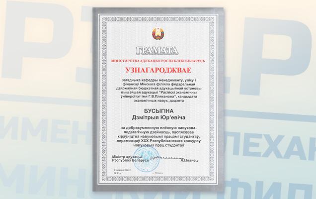 За многолетнюю успешную научно-педагогическую деятельность, успешное руководство научными работами студентов, победителей XXX Республиканского конкурса научных работ студентов заведующий кафедрой менеджмента, учета и финансов Минского филиала, кандидат экономических наук, доцент Бусыгин Дмитрий Юрьевич награжден Грамотой Министерства образования Республики Беларусь.