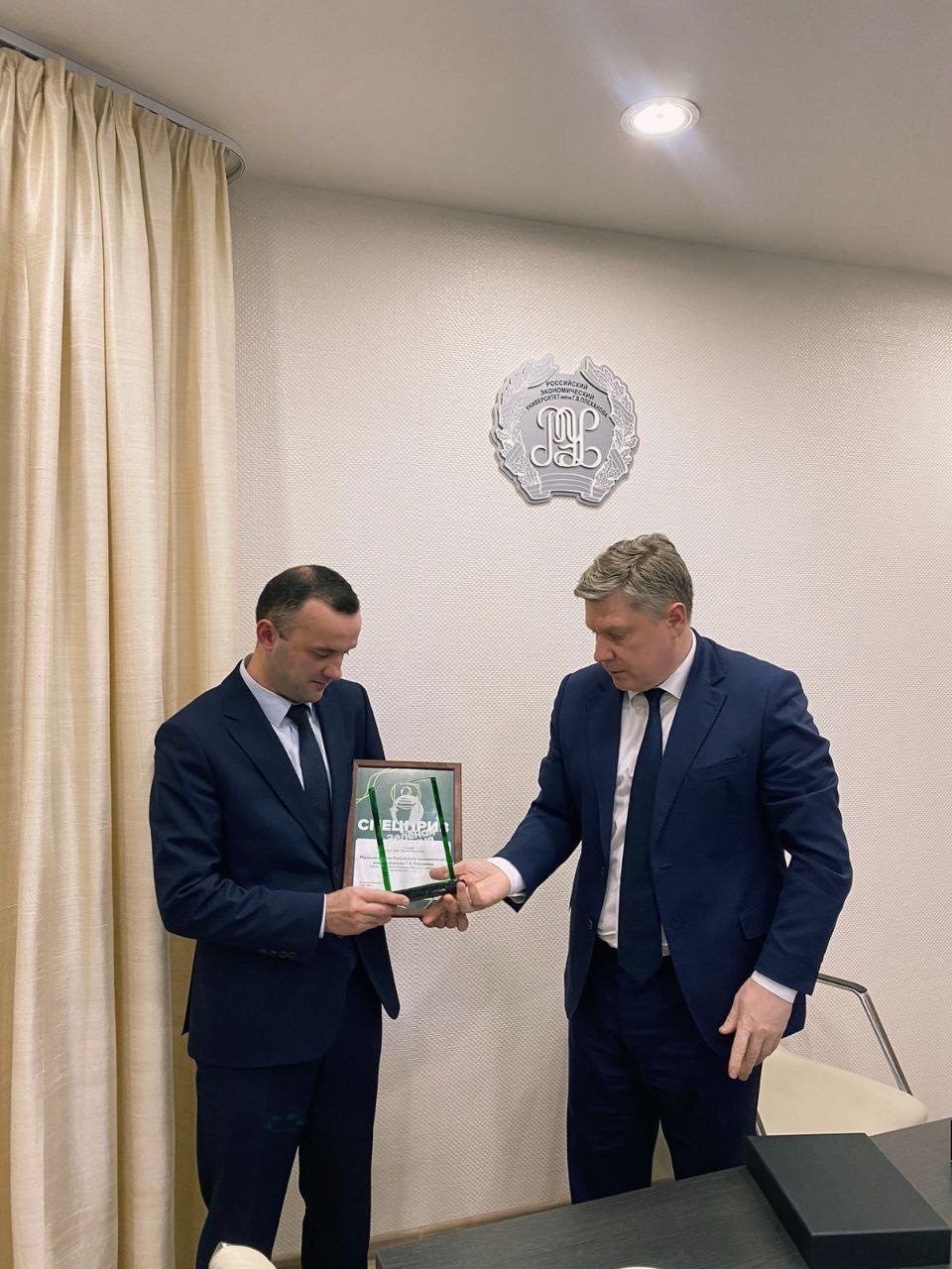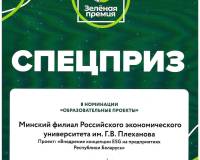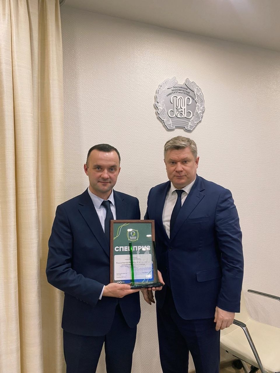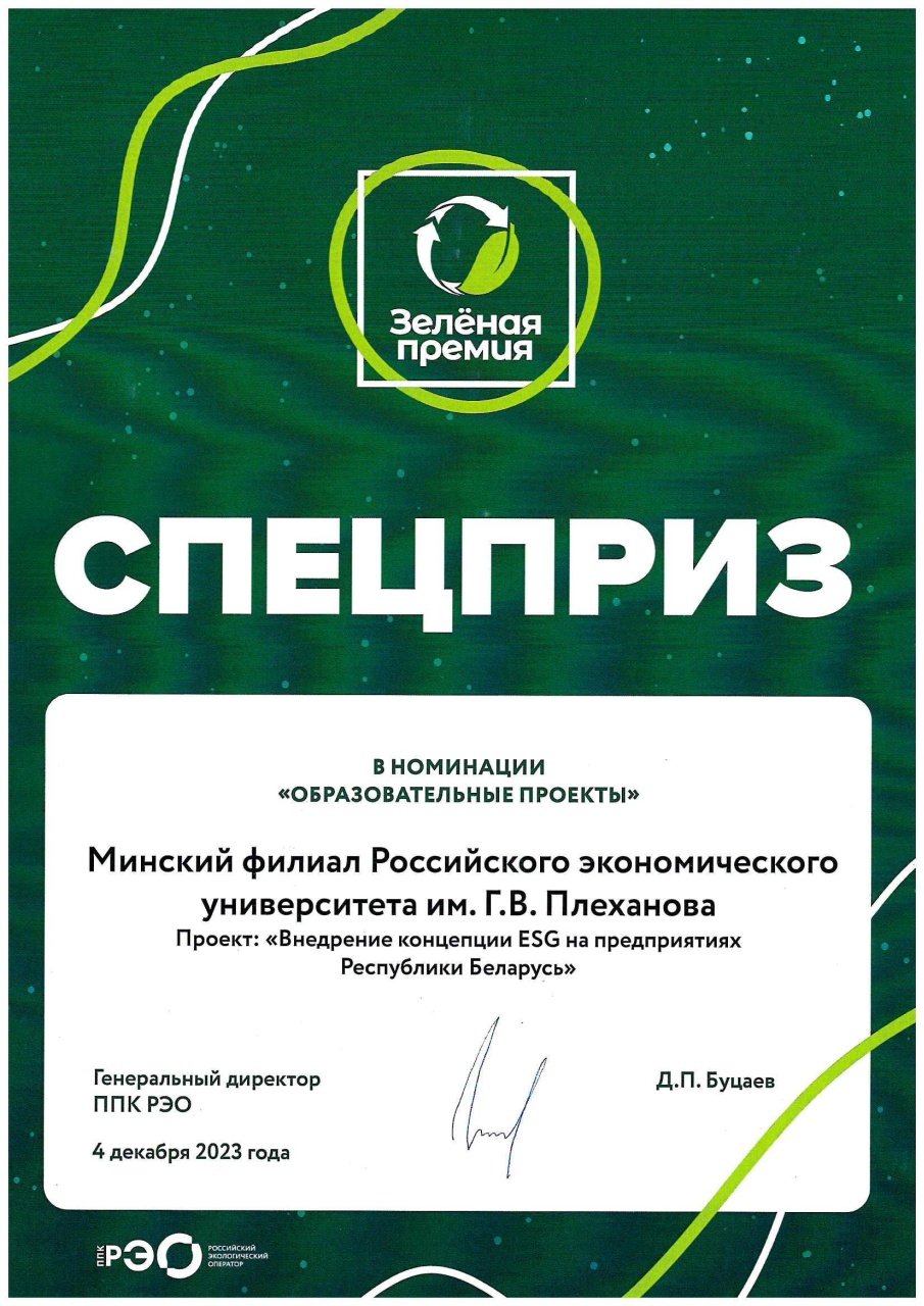 Ректор РЭУ им. Г.В. Плеханова Иван Васильевич Лобанов вручил награду конкурса «Зелёная премия – 2023» директору Минского филиала Алексею Борисовичу Елисееву во время его рабочей поездки в головной вуз. Проект Минского филиала РЭУ им. Г.В. Плеханова «Внедрение концепции ESG на предприятиях Республики Беларусь» стал призёром в номинации «Образовательные проекты».