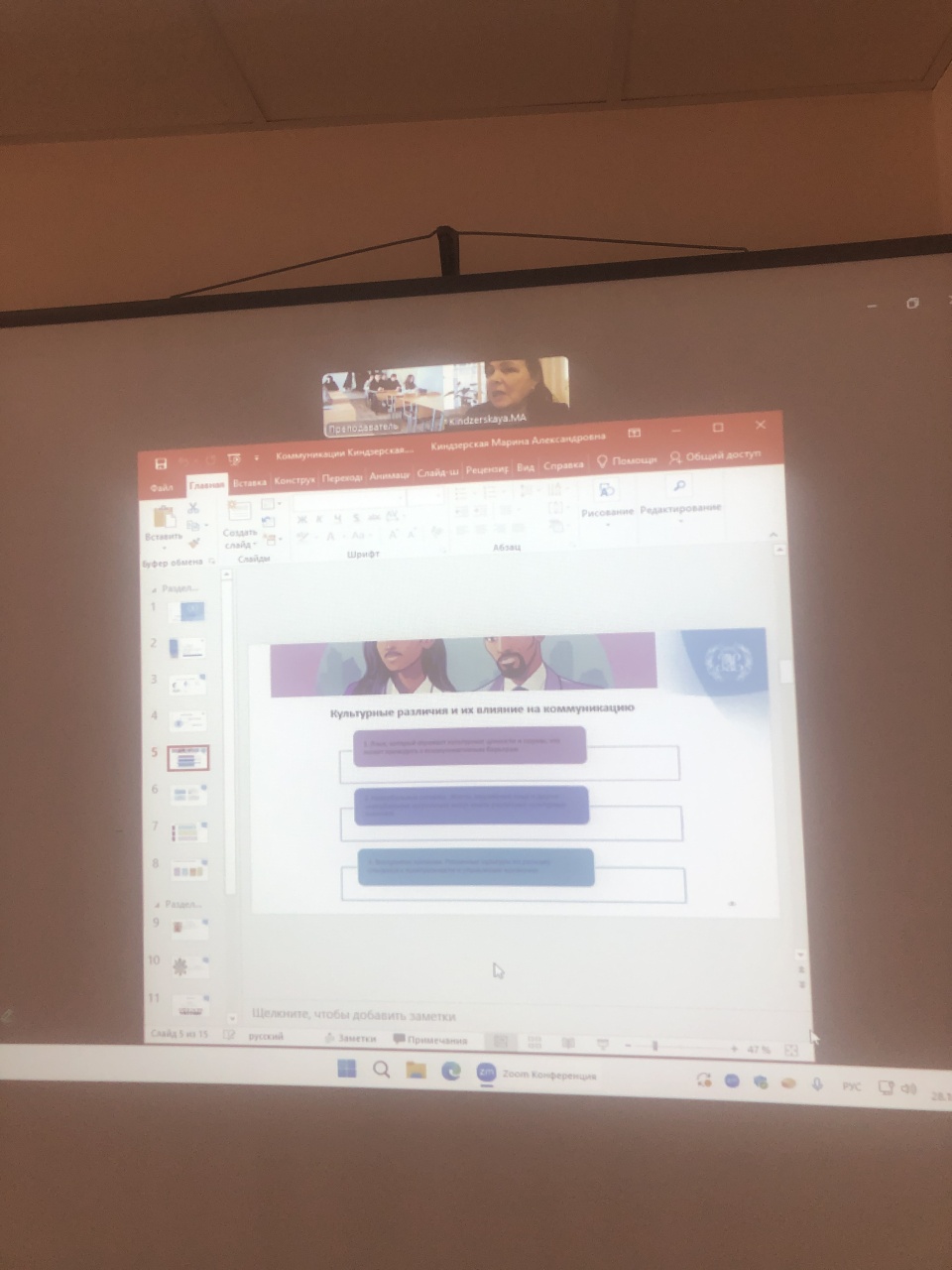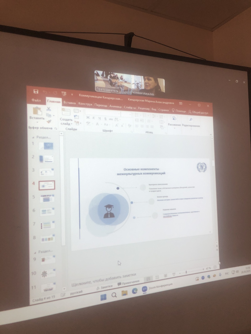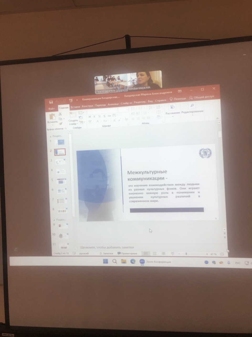 Занятия со студентами провела Киндзерская Марина Александровна, кандидат культурологии, доцент кафедры истории и философии РЭУ им. Г.В. Плеханова. В рамках лекций студенты познакомились с культурно-антропологическим аспектом деловой коммуникации, коммуникативным аспектом межкультурной коммуникации, основными теориями межкультурных деловых коммуникаций.