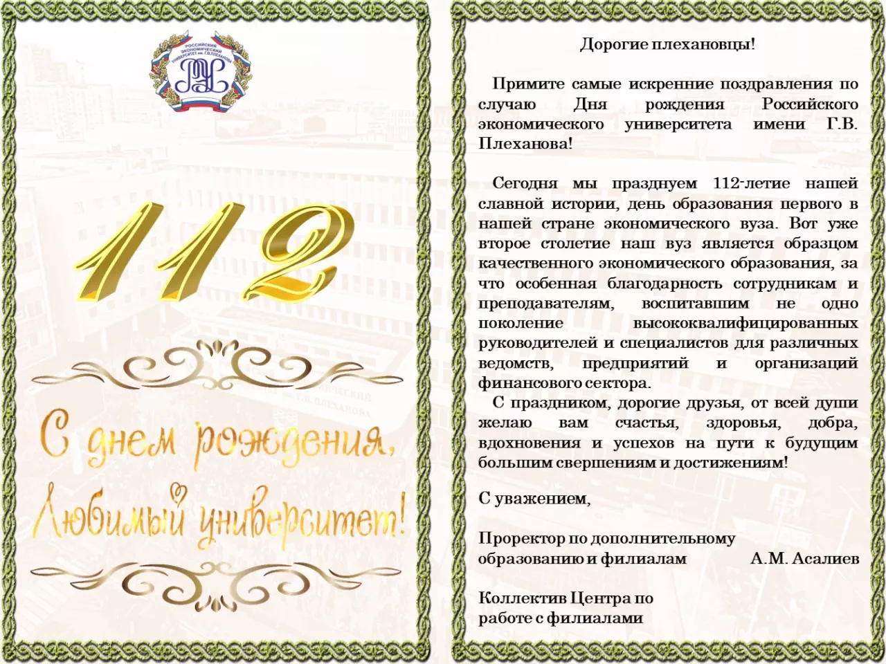 Поздравление проректора РЭУ им. Г.В. Плеханова А.М. Асалиева с Днем рождения Университета