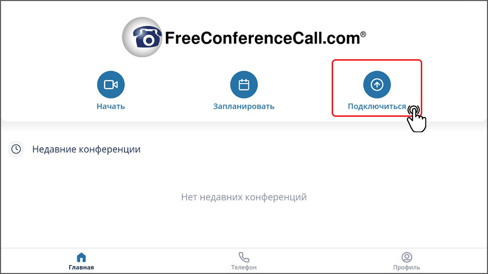 1. Запустите приложение FreeConferenceCall и нажмите на кнопку "Подключиться":