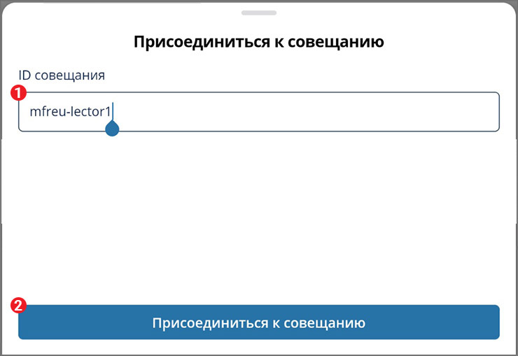 2. Введите ID совещания (1) и нажмите на кнопку "Присоединиться к совещанию" (2):