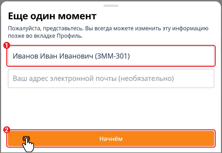 4. Введите ваше имя (1) и нажмите на кнопку "Начнём" (2):