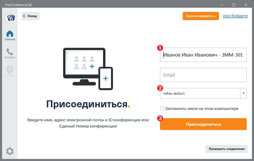 2. Введите Ваше имя (1), ID онлайн совещания (2) и нажмите на кнопку "Присоединиться" (3):