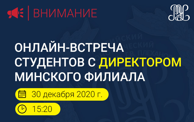 Уважаемые студенты! 30 декабря 2020 года в 15:20 пройдёт онлайн-встреча директора Минского филиала РЭУ им. Г.В. Плеханова со студентами филиала.