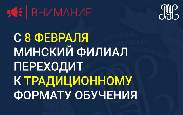 Информируем, что с 8 февраля 2021 г. Минский филиал РЭУ им. Г.В. Плеханова возвращается к традиционному формату обучения.
