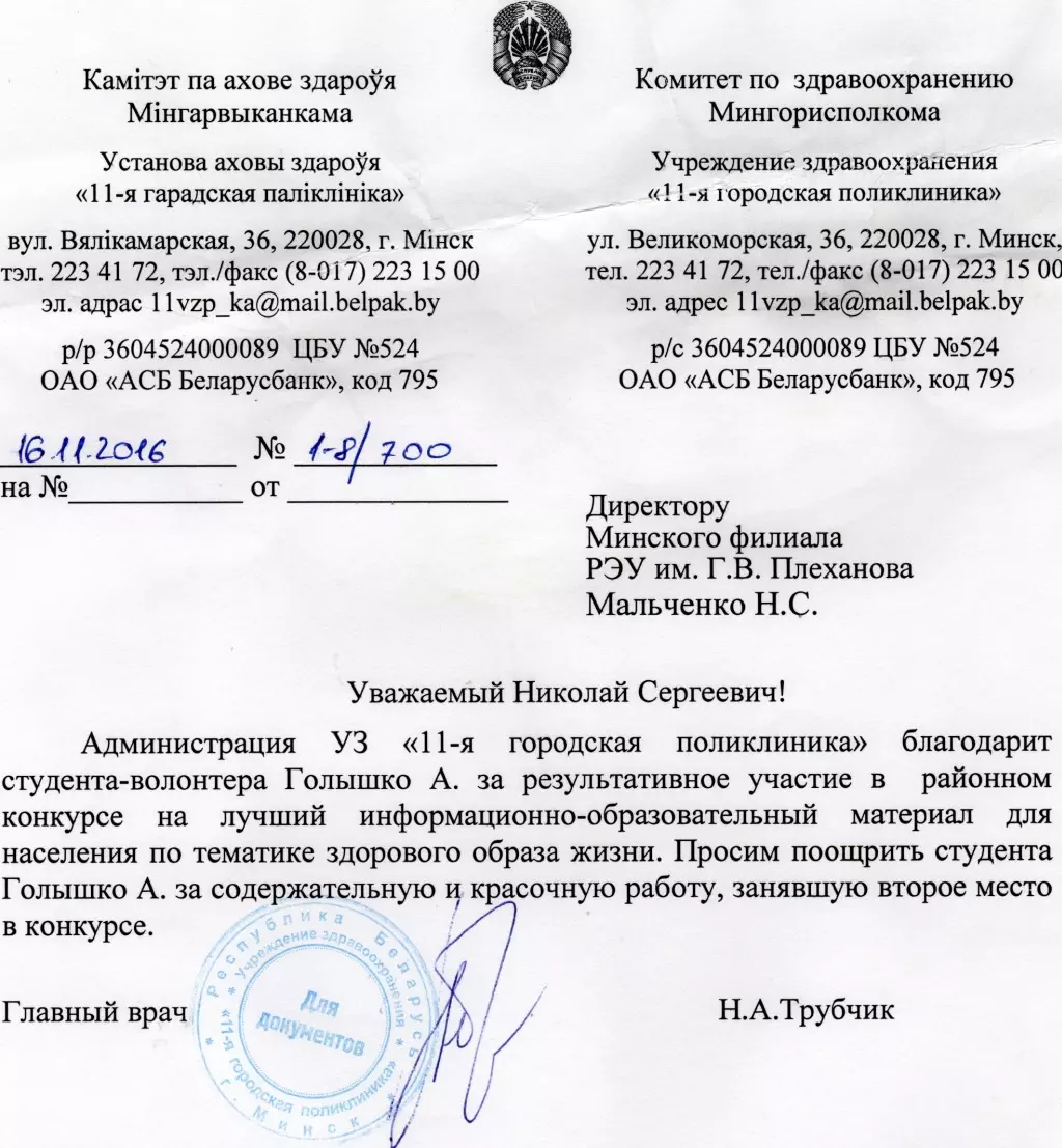 Минский филиал РЭУ им. Г.В. Плеханова принял участие в районном конкурсе Ленинского района г. Минска на лучший информационно-образовательный материал для населения по тематике здорового образа жизни. Тема конкурса - "Физическая активность и здоровье - ваши верные спутники".