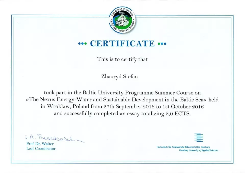 Студенты Минского филиала РЭУ им. Г.В. Плеханова Стефан Жаврид и Анастасия Кленицкая получили сертификаты Летней школы Балтийской университетской программы «Устойчивое развитие в области энергетики и водного менеджмента в Балтийском регионе» (3 кредитных единицы), проходившей в Высшей банковской школе, г. Вроцлав, Польша, с 27 сентября по 1 октября 2016 г.