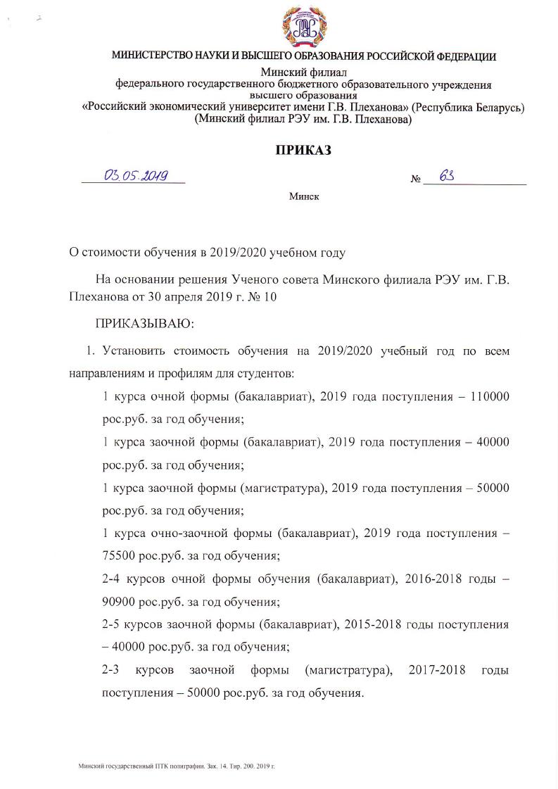 На основании решения Ученого Совета Минского филиала РЭУ им. Г.В.Плеханова (протокол № 63 от 03.05.2019 г.) утверждена стоимость обучения на 2019-2020 учебный год для студентов всех курсов.